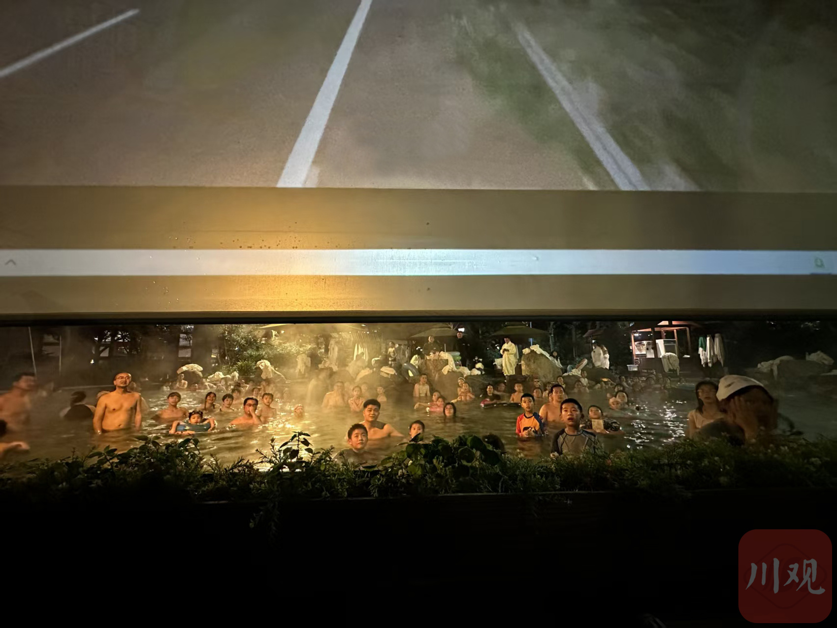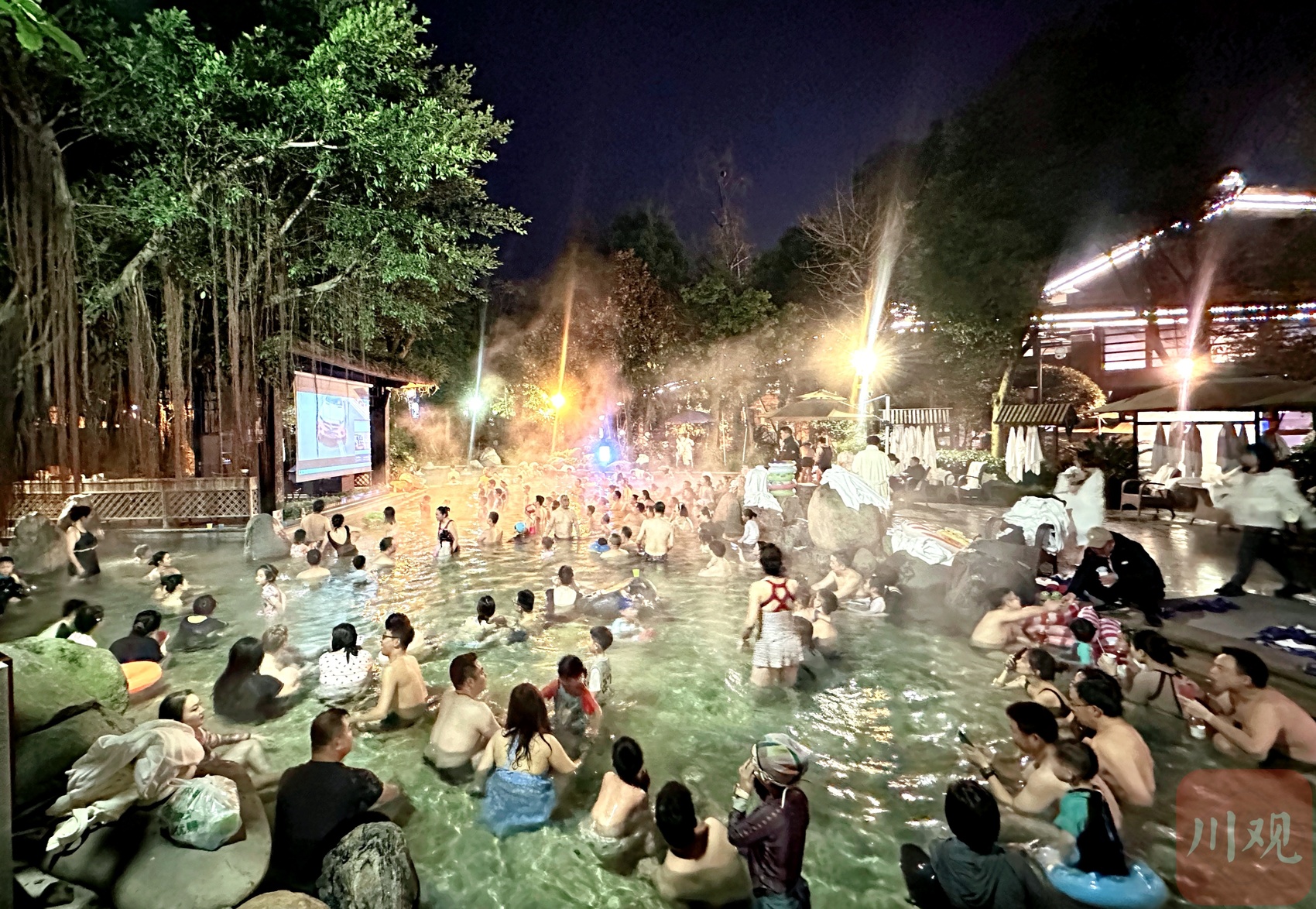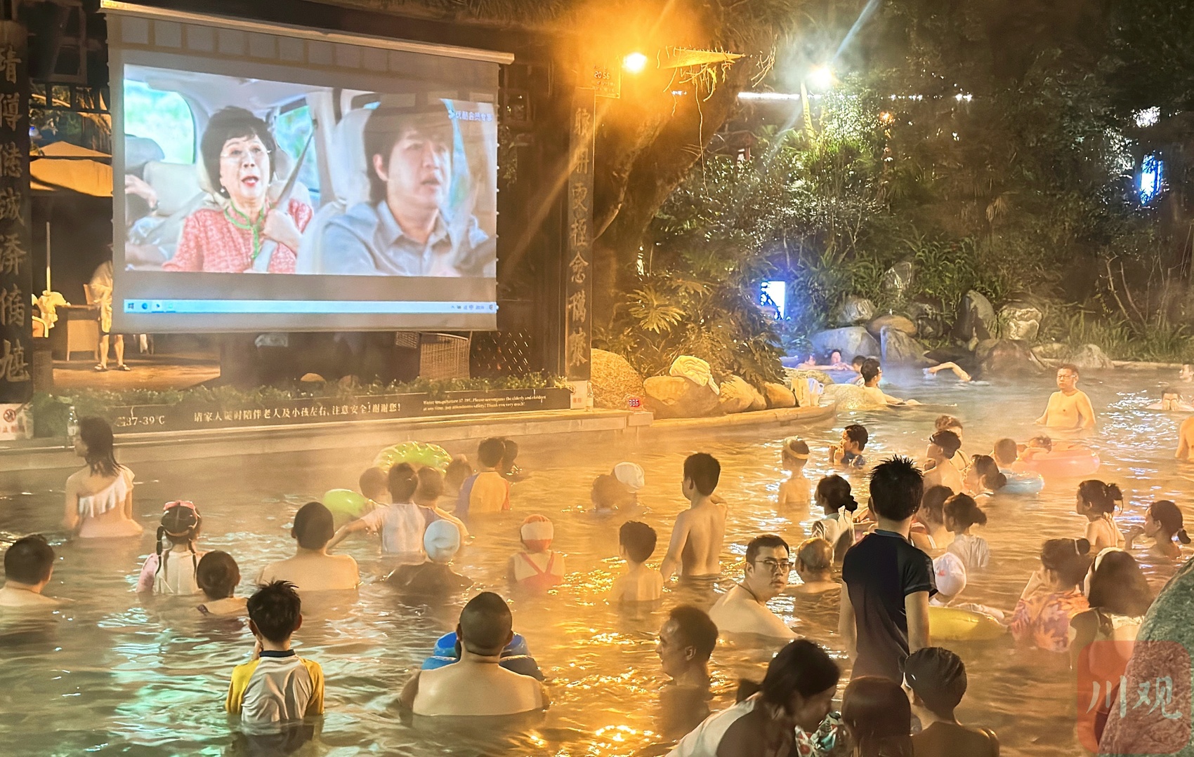 记者在现场看到,大小温泉池散落林间,游客多以家庭或朋友结伴为主。除了泡汤,池畔区域设置了露天电影放映,同时安排了川剧变脸、茶艺表演等特色节目。不远处的餐饮区内,火锅、小吃等持续供应,进一步丰富了游客的体验内容。